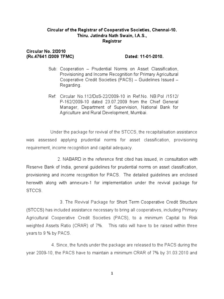 Circular Go 2010 Capital Adequacy Ratio Banks The office of registrar of cooperative societies is the registering and controlling authority of all the cooperative societies.